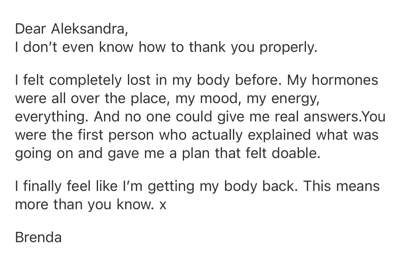 Within 72 hours I create your Root Cause Analysis โ what I believe is driving your symptoms โ and your first Hormone Protocol: specific herbs, supplements, dietary and lifestyle adjustments, chosen precisely for you. You receive this as a PDF with a voice note walking you through it.