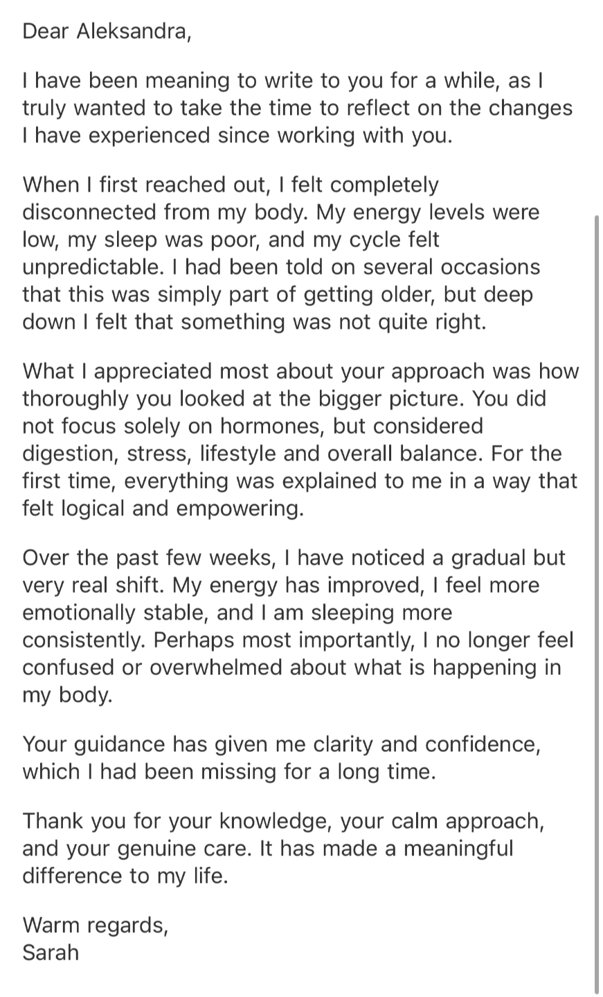 I have now supported over 400 women through their hormonal health journeys. What I bring to each one is rare: the scientific rigour to understand what is happening in your body, and the clinical herbal knowledge to support it naturally โ in the precise sequence it needs.